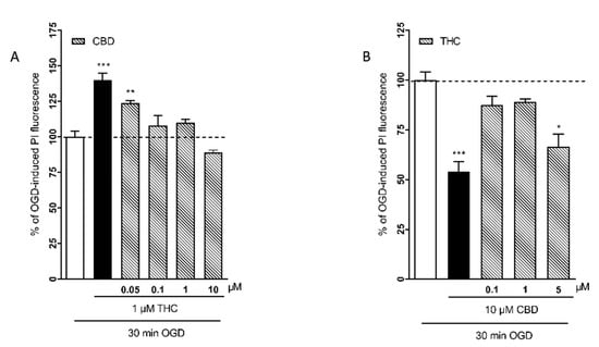Effects of different combinations of THC and CBD concentrations in rat organotypic hippocampal slices exposed to OGD. (A) When the slices were incubated with the relative concentrations of CBD increased (0.1–10 µM), the neurotoxic effect of THC was lost. (B) The combination of 10 µM CBD with 5 µM THC was neuroprotective, but when the relative concentrations of THC were lower, the effect was lost. Bars represent the mean ± SEM of at least 5 experiments run in quadruplicate. * p < 0.05, ** p < 0.01 and *** p < 0.01 vs. OGD (one-way ANOVA plus Dunnett’s test).