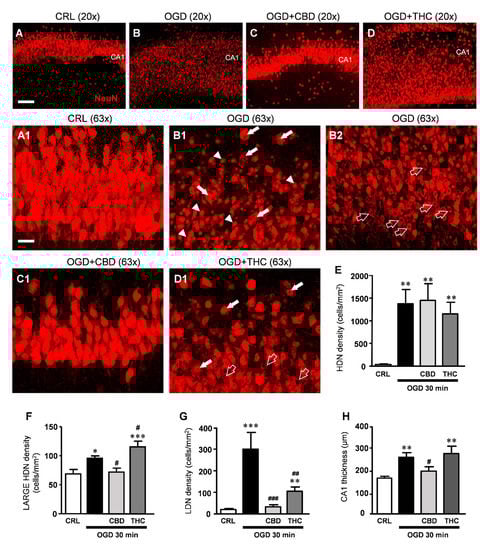 (A–D) Representative confocal images of neurons immunostained using antibodies against NeuN in CA1 of a CRL (A), OGD (B), OGD + CBD (C), and OGD + THC slice (D) captured with a 20x objective, scale bar: 75 µm. (A1–D1) Confocal images obtained stacking 10 consecutive z-scans acquired in the depth of the corresponding slice shown in (A–D), respectively (0.3 µm each, total thickness 3 µm), captured with a 63x objective. A1: Image taken from the control slice in A showing healthy pyramidal neurons in CA1. (B1,B2) Both images of CA1 were taken from the OGD slice in (B) and show clearly that neurons are profoundly damaged after OGD. (B1) HDN neurons (arrowheads), large HDN neurons (white arrows); (B2) LDN neurons (open arrows). (C1) The image of CA1 taken from the OGD + CBD slice in (C) shows that pyramidal neurons have a healthy appearance. (D1) The image taken from the OGD + THC slice in (D) shows large HDN neurons (white arrows) and LDN neurons (open arrows). (A1–D1) scale bar: 20 µm. (E–G) Quantitative analyses of neuronal morphological alterations in CA1. (E) density of HDN neurons. Statistical analysis: one-way ANOVA p < 0.001; ** p < 0.01 vs. CRL, Newman–Keuls post hoc test; (F) density of large HDN neurons. Statistical analysis: One-way ANOVA p < 0.0001; * p < 0.05 and *** p < 0.001 vs. CRL, # p < 0.05 vs. OGD, Newman–Keuls post hoc test. (G) density of LDN neurons. Statistical analysis: One-way ANOVA p < 0.0001; ** p < 0.01 and *** p < 0.001 vs. CRL, ### p < 0.001 vs. OGD, ## p < 0.01 vs. OGD and OGD + CBD, Newman–Keuls post hoc test). (H) Thickness of CA1. Statistical analysis: One-way ANOVA p < 0.01; ** p < 0.01 vs. CRL, # p < 0.05 vs. OGD, Newman–Keuls post hoc test. Bars represent the mean ± SEM of at least 8 experiments.