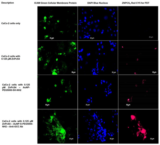 Firstly, CRC CaCo-2 and WS1 cells were seeded at a density of 6 × 105 cells/mL into various control and experimental grouped culture plates, which contained pre-sterilized coverslips. The cultures were treated with a pre-determined dose response of 0.125 μM ZnPcS4 PS, ZnPcS4-AuNP-S-PEG5000-NH2 and BNC in 3 mL culture media. The cells were incubated at 37 °C for 24 h in the dark. After incubation, the cells were fixed with 1 mL of 3.7% (v/v) formaldehyde solution for 10 min. Thereafter, they were stained for 30 min with 2 µg/mL ICAM-1 mouse monoclonal IgG1 (AbAB2213 AC: Abcam) and 5 µg/mL goat anti-mouse IgG-FITC (AB6785 AC: Abcam) on ice. The cells were then stained with µL of 1 µg/mL DAPI for 5 min at room temperature and rinsed with HBSS. The coverslips were then mounted onto slides and examined using a Carl Zeiss Axio Z1 Observer immuno-fluorescent microscope, with the above discussed various filter fluorescent settings, at 400× magnification. All experimentation was performed in the dark to prevent photobleaching.