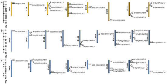 Chromosomal localization and distribution of JAZ genes in I. batatas (a), I. trifida (b), and I. triloba (c). The bars represent chromosomes, the chromosome numbers are displayed on the left side, and the gene names are displayed on the right side. The relative chromosomal localization of each JAZ gene is marked on the black line of the right side and indicated by the unit Mbp. Details chromosomal location information is listed in Table S1.