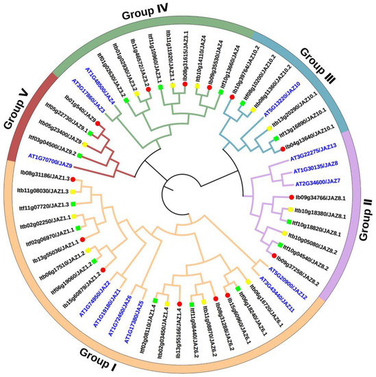Phylogenetic analysis of the JAZ family in I. batatas, I. trifida, I. triloba, and Arabidopsis. A total of 56 JAZs were divided into five subgroups (Group I to V) according to the evolutionary distance. The red circles represent the 14 IbJAZs in I. batatas. The green squares represent the 15 ItfJAZs in I. trifida. The yellow squares represent the 14 ItbJAZs in I. triloba. The blue letters represent the 13 AtJAZs in Arabidopsis.