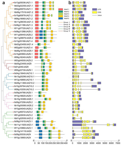 Conserved motifs and exon–intron structure analysis of JAZ family in I. batatas, I. trifida, and I. triloba. (a) The phylogenetic tree showed that JAZs were distributed to five subgroups in the left, and the five conserved motifs were shown in different colors. The red squares represent the IbJAZs. (b) Exon–intron structures of JAZs. The purple boxes, yellow boxes, and black lines represent the UTRs, exons, and introns, respectively.
