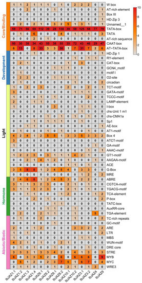 Cis-elements analysis of IbJAZs in I. batatas. The cis-elements were divided into five broad categories. The degree of red colors represents the number of cis-elements upstream of the IbJAZs.