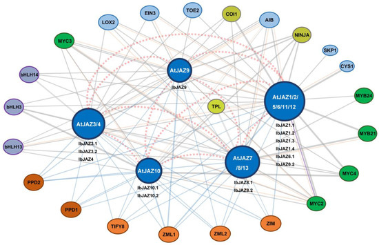 Functional interaction networks of IbJAZ in I. batatas according to orthologues in Arabidopsis. Network nodes represent proteins, and lines represent protein–protein associations. The red dotted lines represent the strong interactions of JAZs with each other. The gray lines represent physical interactions. The blue lines represent shared protein domains. The orange lines represent co-expression. The purple lines represent co-localization. The line thickness represents the strength of the interaction.