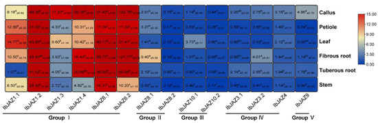 To investigate the potential biological functions of IbJAZs in growth and development, the expression levels in six representative tissues (i.e., callus, petiole, leaf, fibrous root, tuberous root, and stem) of I. batatas were analyzed using real-time quantitative PCR (qRT-PCR) (Figure 6). Interestingly, different subgroups showed diversified expression patterns in six tissues. IbJAZs in Group I showed higher expression levels in all tissues than in other subgroups. Among all the IbJAZs, three IbJAZs (i.e., IbJAZ1.2, IbJAZ6.1, and IbJAZ6.2) were highly expressed, whereas two IbJAZs (i.e., IbJAZ8.2 and IbJAZ10.2) were low-expressed in all tissues. Nevertheless, some IbJAZ showed tissue-specific expression, e.g., IbJAZ8.1 was highly expressed in fibrous root, IbJAZ10.1 was highly expressed in leaf, IbJAZ3.2 was highly expressed in roots, IbJAZ9 was highly expressed in callus, but IbJAZ1.1 was lowly expressed in the tuberous root. These results indicated that IbJAZs might play different roles in the tissue development of sweet potato.