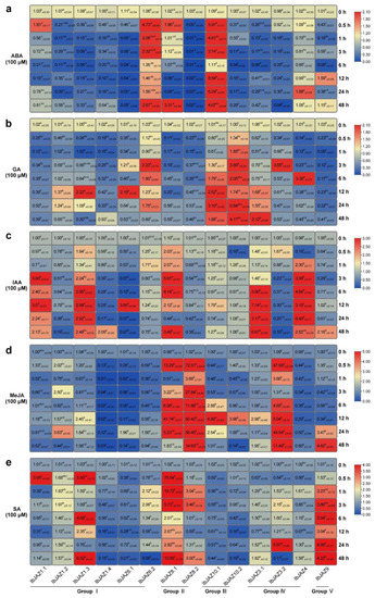 Gene expression patterns of IbJAZs in response to different phytohormone, i.e. (a) ABA, (b) GA, (c) IAA, (d) MeJA, and (e) SA of I. batatas. The values were determined by RT-qPCR from three biological replicates consisting of pools of three plants, and the results were analyzed using the comparative CT method. The expression of 0 h in each treatment was considered as “1”. The fold change ± SD was shown in the boxes. Different lowercase letters indicate a significant difference of each IbJAZ at p < 0.05 based on Student’s t-test.