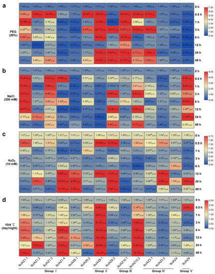 Gene expression patterns of IbJAZs in response to abiotic stresses, i.e. (a) PEG, (b) NaCl, (c) H2O2, and (d) 10/4 °C treatments of I. batatas. The values were determined by RT-qPCR from three biological replicates consisting of pools of three plants, and the results were analyzed using the comparative CT method. The expression of 0 h in each treatment was considered as “1”. The fold change ± SD was shown in the boxes. Different lowercase letters indicate a significant difference of each IbJAZ at p < 0.05 based on Student’s t-test.