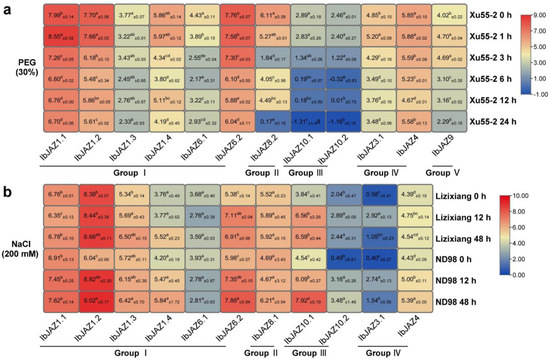 Moreover, we analyzed the expression patterns of IbJAZs using the RNA-seq data of a drought-tolerant variety Xu55-2 under PEG treatment and the RNA-seq data of a salt-sensitive variety Lizixiang and a salt-tolerant line ND98 under NaCl treatment [45,46]. Consistent with qRT-PCR results (Figure 8), the expression of IbJAZ6.1 was also repressed in Xu55-2 under PEG treatment (Figure 9a), and the expression of some IbJAZs (e.g., IbJAZ1.3, IbJAZ1.4, and IbJAZ10.2) were induced in ND98 under NaCl treatment (Figure 9b). Excluding IbJAZ1.2 and IbJAZ10.2, expression patterns of other IbJAZs were similar in both Lizixiang and ND98 under NaCl treatment (Figure 9b). Taken together, these results indicated that IbJAZs were differentially expressed in response to various abiotic stresses in sweet potato.