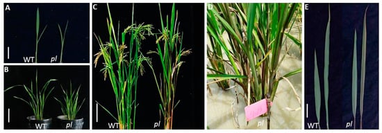 Phenotypic features of WT and pl mutant rice plants. Plants at (A) seedling stage, bar: 2 cm; (B) tillering stage, bar: 10 cm; (C) grain filling stage, bar: 10 cm; (D) pl plants showing purple color at field condition; (E) magnification of flag leaf from the top of the plant, bar = 5 cm.