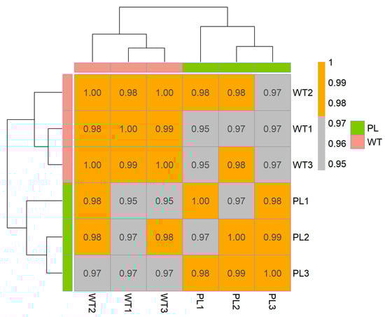 The correlation coefficient of gene expression values among the tested samples reflects the consistency of the RNA-Seq data of the samples. The correlation coefficient among the p1 samples was 0.98, whereas it was 0.96 in WT samples, indicating the consistency of the RNA-seq data among the samples because the values were in the vicinity of unity [18].