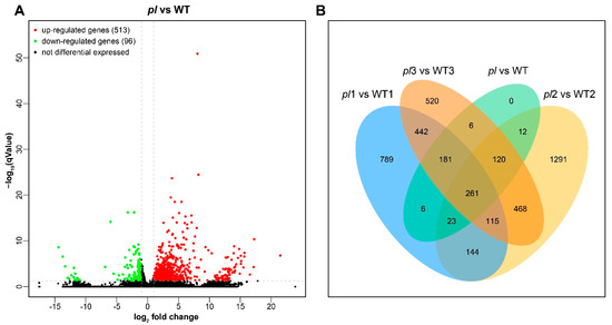 The DEGs pl vs. WT were identified and it was predicted that the genes are involved in the purple leaf color of pl mutant (Table S3). The Volcano plot shows the distribution of DEGs at the threshold level for selection. Among 609 DEGs, 513 and 96 were up- and down-regulated in pl vs. WT, respectively (Figure 3A, Table S4). In the Venn diagram, a total of 261 genes were identified as commonly shared for all samples (Figure 3B).