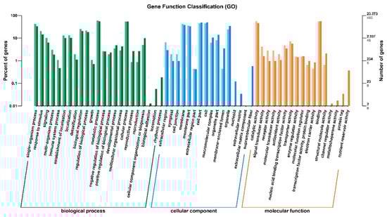 GO analysis of the functional enrichments of down- and up-regulated DEGs between pl vs. WT at late grain filling stage. Here, horizontal axis represents functional category and vertical axis represents the gene number in the category (right) and the percentage of the total genes on the annotation (left). Various colors signify various categories. Light color on the axis and histogram represents the differentially expressed genes, and dark color represents total number of genes in the respective categories.