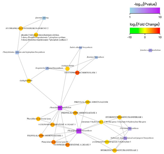 A gene interaction network diagram was generated to identify the involvement of DEGs and their contribution to specific biological phenomena. Most of the genes were found in phenylalanine metabolism, phenylpropanoid biosynthesis, flavonoid biosynthesis, and stilbenoid, diarylheptanoid with gingerol biosynthesis pathways (Figure 6 and Table S8).