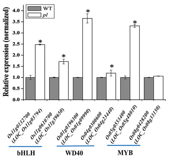 The transcription factor families—MYB, WD40, and bHLH—were found to be involved in the anthocyanin biosynthetic process in pl mutant. Four DEGs of each of the MYB, bHLH, and WD40 family were identified in RNA-seq data (Table 3 and Figure 8). Candidate transcription factors were screened out through quantification of relative expression by qRT-PCR. Among them, two MYB genes (Os05g0553400 (OsMYB55) and Os08g0428200), two bHLH family genes (Os01g0196300 and Os04g0300600), and two WD40 family genes (Os11g0132700 and Os11g0610700) showed up-regulation in pl mutant. These genes might have vital roles in establishing the purple leaf color in pl mutant and could provide information on anthocyanin biosynthesis mechanisms in rice.