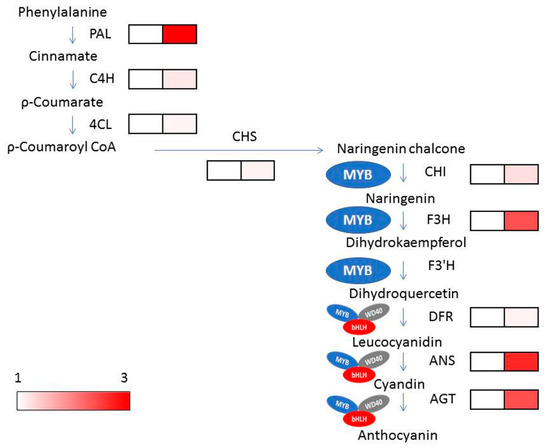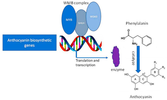 The anthocyanin biosynthesis pathway starts from phenylalanine under synchronized regulation of structural genes in the cytoplasm, which encode some regulatory transcription factors and enzymes [11]. Glutathione S-transferases export the anthocyanins from cytoplasm to the vacuole, and they are stored there permanently [12]. The anthocyanin biosynthesis process involves three consecutive stages: firstly, phenylalanine is transformed into transcinnamic acid and 4CL (4-coumarate-CoA ligase), respectively [4,8,13]; thereafter, CHS (chalcone synthase), CHI (chalcone isomerase), and F3H (flavanone-3-hydroxylase) are catalyzed a series of enzymatic reactions and formed dihydroflavonol from one molecule of coumarate-CoA and three molecules of malonyl-CoA; finally, anthocyanidins are produced from dihydroflavonols via catalyzing of DFR (dihydroflavonol 4-reduatse) and ANS (anthocyanidin synthase). These anthocyanidins are modified for glycosylation and methylation to produce anthocyanins through the action of UFGT (UDP glucose: flavonoid glucosyltransferase) and MT (methyl transferase) [14,15]. Earlier studies proved that the expression of the structural genes is regulated by synchronized interactions of R2R3-MYB (myeloblastosis family), WD40-repeat transcription factors, and bHLH (basic helix–loop–helix) [16]. MBW complex (R2R3-MYB, WD40, and bHLH) is very important to plants; its transcriptional regulatory system might be different between mono- and dicotyledonous plants, and all members of this MBW complex are not obligatory for anthocyanin biosynthesis in all species [14,15].