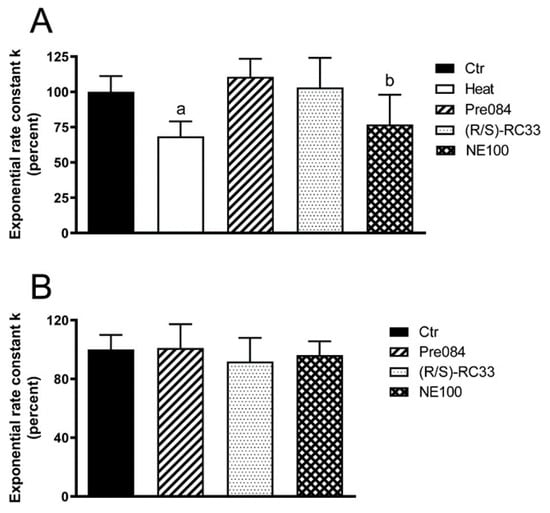 Effect of S1R modulators on the water permeability of HeLa cells in heat-stress conditions (A) and in normal non-stressed conditions (B). Bars represent the osmotic water permeability of HeLa cells expressed as percent of the exponential rate constant k. Values are means ± SD of 4–15 single shots (time course curves) for each of 4–6 different experiments. (A) HeLa cells were exposed to a 150 mOsm osmotic gradient in different conditions: untreated cells (Controls, Ctr); cells treated at 42 °C for 3 h (heat-stressed, Heat); heat-stressed cells pre-treated with test compounds (Pre084, (R/S)-RC33 and NE100) at 20 μM final concentration. (B) HeLa cells were incubated at 21 °C for 3 h with the compounds at 20 μM final concentration and, successively, were exposed to a 150 mOsm osmotic gradient. Controls (Ctr) indicate cells incubated without compounds. a, p < 0.05 vs. Ctr, Pre084, (R/S)-RC33; b, p < 0.05 vs. Ctr (Repeated measures ANOVA, followed by Newman-Keuls’s Q test).