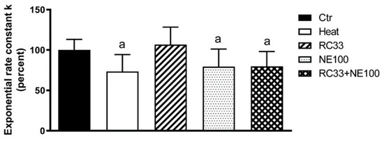 Effect of the NE100 and (R/S)-RC33 co-administration on the water permeability of HeLa cells in heat-stress condition. Comparison between untreated cells (Controls, Ctr), cells treated at 42 °C for 3 h (heat-stressed, Heat), heat-stressed cells pre-treated separately with NE100 and (R/S)-RC33 at 20 μM and heat-stressed cells pre-treated simultaneously with NE100 and (R/S)-RC33. Bars represent the osmotic water permeability of HeLa cells expressed as percent of the exponential rate constant k. Values are means ± SD of 4–15 single shots (time course curves) for each of 4–6 different experiments. a, p < 0.05 vs. Ctr, (R/S)-RC33 (Repeated measures ANOVA, followed by Newman-Keuls’s Q test).
