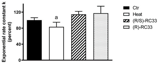Effect of the RC33 stereochemistry on the water permeability of HeLa cells in heat-stress condition. Comparison between untreated cells (Controls, Ctr), cells treated at 42 °C for 3 h (heat-stressed, Heat), heat-stressed cells pre-treated with racemic (R/S)-RC33 and enantiopure (R)-RC33 at 20 μM final concentration. Bars represent the osmotic water permeability of HeLa cells expressed as percent of the exponential rate constant k. Values are means ± SD of 4–15 single shots (time course curves) for each of 4–6 different experiments. a, p < 0.05 vs. Ctr, (R/S)-RC33, (R)-RC33 (Repeated measures ANOVA, followed by Newman-Keuls’s Q test).