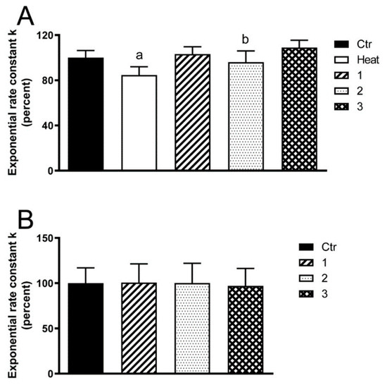 Effect of compounds 1–3 on the water permeability of HeLa cells in heat-stress condition (A) and in normal non-stressed condition (B). (A) Comparison between untreated cells (Controls, Ctr), cells treated at 42 °C for 3 h (heat-stressed, Heat), heat-stressed cells pre-treated with test compounds at 20 μM final concentration. (B) Effect of the compounds on water permeability of HeLa cells incubated at 21 °C for 3 h. Controls (Ctr) indicate cells incubated without compounds. Bars represent the osmotic water permeability of HeLa cells expressed as percent of the exponential rate constant k. Values are means ± SD of 4–15 single shots (time course curves) for each of 4–6 different experiments. a, p < 0.01 vs. Ctr, 1, 2, 3; b, p < 0.05 vs. 3 (Repeated measures ANOVA, followed by Newman-Keuls’s Q test).