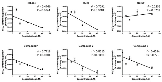 Dose–response effect of compounds Pre084, RC33, NE100, 1, 2 and 3 on HeLa cells H2O2 content. HeLa cells were heat-stressed at 42 °C for 3 h and pre-treated with increasing concentrations of test compounds. H2O2 was measured using the CM-H2DCFDA reagent (see Materials and methods). Values represent mean ± SD (n = 4) and are expressed as H2O2 content (arbitrary unit) per mg protein. When not shown, SD were within the symbol area. Overall, linear regression (black line) is presented. p and r2 values are shown.