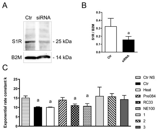 Effect of compounds Pre084, RC33, NE100, 1–3 on the water permeability of S1R silenced HeLa cells in heat-stress condition. (A) HeLa cells were silenced and the effectiveness in silencing was tested by immunoblotting. A representative blot is shown. 30 μg of proteins were loaded and the blots incubated with anti-S1R antibody. Blots were stripped and re-probed with anti β-2-microglobulin (B2M) antibody. Bands of 25 and 14 kDa were obtained for S1R and B2M, respectively. (B) Densitometry was performed by acquiring the blot with the iBright CL1000 imaging system. Semiquantitation was performed by iBA (iBright Analysis Software) and the results were normalized to the corresponding B2M. A significant reduced protein expression in silenced (siRNA) cells compared to controls (scrambled; Ctr) was observed (a, p < 0.001; Student’s t test). (C) Effect of S1R agonist treatment on the water permeability of S1R-KD HeLa cells heat-stressed (Heat). The compounds were used at 20 μM final concentration. Ctr NS, control HeLa cells Not Silenced; Ctr, control, untreated HeLa cells silenced for S1R. Values are means ± SD of 4–15 single shots (time course curves) for each of 4–6 different experiments. a, p < 0.05 vs. Ctr NS, Pre084, 1, 2, 3 (ANOVA, followed by Newman-Keuls’s Q test).