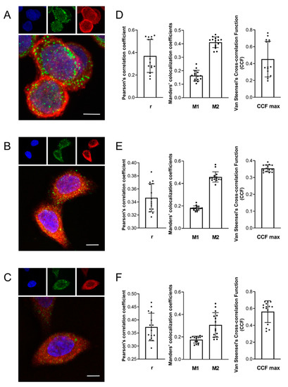 - Manders, E.M.M.; Verbeek, F.J.; Aten, J.A. Measurement of co-localization of objects in dual-colour confocal images. J. Microsc. 1993, 169, 375–382. [Google Scholar] [CrossRef]