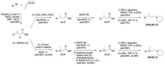 Briefly, a Heck reaction between 4-Bromobiphenyl and ethyl crotonate was performed to access α, β-unsaturated ester 4. This was subjected to a reduction of the double bond, performed either without stereocontrol (H2 gas in presence of Pd/C) or under enantioselective conditions (H2 gas in presence of a chiral Ir catalyst), to access racemic 5 and (R)-5 respectively. Ester hydrolysis afforded acid 6, which could be subjected to fractional crystallization to enhance the enantiomeric excess in the synthesis of enantiopure RC33. Acid 6 was then subjected to amidation with piperidine in the presence of condensing agent TBTU. Afterwards, reduction of the amide moiety with LiAlH4 afforded RC33 either in racemic or enantiopure form (ee 98%). The identity of obtained products was confirmed by 1H- and 13C-NMR, whereas optical purity was assessed by chiral-HPLC following the method developed in our lab. Overall, the analyses resulted consistent with published data [41,55].