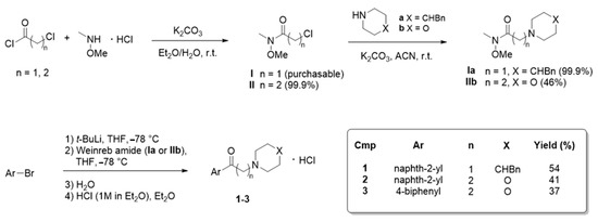 Compounds 1–3 were prepared following the procedure reported in our previous publication, with slight modifications [45]. Overall, the synthetic strategy is based on the Weinreb ketone synthesis, as shown in Scheme 2.