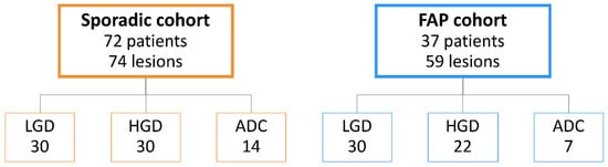 Cohort characterization, encompassing sporadic and Familial Adenomatous Polyposis (FAP) lesions. LGD, low-grade dysplasia; HGD, high-grade dysplasia; ADC, invasive adenocarcinoma.