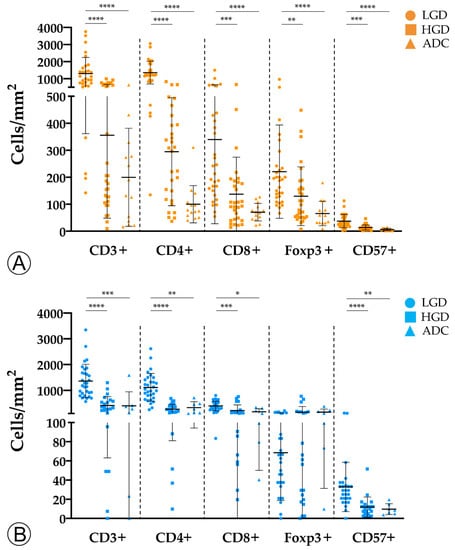 To investigate the evolution of the tumor immune microenvironment along the colorectal ACS, we analyzed the density and quality of the immune infiltration in adenomatous lesions with LGD, with HGD, and in invasive ADCs. By immunohistochemistry and counting representative areas, we analyzed and normalized the density of the overall population of CD3+ T lymphocytes per mm2, as well as the specific populations of CD4+ helper T cells, cytotoxic CD8+ T lymphocytes, Foxp3+ regulatory T cells, and CD57+ T lymphocytes/natural killer (NK) cells.