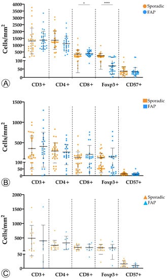 Comparison of immune cell counts between sporadic and hereditary Familial Adenomatous Polyposis (FAP)-related lesions in adenomatous lesions with low-grade dysplasia (A), adenomatous lesions with high-grade dysplasia (B), and invasive adenocarcinoma (C). * = p < 0.05; **** = p < 0.0001.