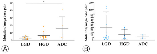 TMB analysis along the colorectal adenoma-carcinoma in sporadic (A) and hereditary Familial Adenomatous Polyposis (FAP)-related (B) lesions. * = p < 0.05. LGD, low-grade dysplasia (circles); HGD, high-grade dysplasia (squares); ADC, invasive adenocarcinoma (triangles); * = p < 0.05.