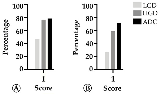 We found that TMB increased throughout the ACS in sporadic cases (Figure 4A), from the median value of 2.76 mutation/mega base pair (mut/Mbp) in LGD lesions to 15.76 mut/Mbp in ADC cases (p < 0.05). In contrast, this trend was not observed in hereditary FAP-related lesions (Figure 4B), where the average number of mut/Mbp remained constant along the ACS, despite the presence of some outlier samples. Likewise, we found that MHC-I expression in neoplastic cells progressively increased throughout the ACS in both FAP-related (p = 0.033) and sporadic (p = 0.025) lesions (Figure 5). MHC-I was expressed at the cell membrane, as well as in the cytoplasm of neoplastic cells (Figure 6).