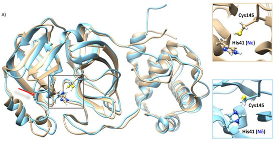 The analysis of the calculated RMSD for the residue pair Cys145-His41 in both the Nδ and Nε forms (shown in Figure S3) allows us to observe that the spatial orientation of the dyad remains constant during the simulation time in the case of His41-Nδ, while a dissimilar trend assumes the RMSD value of His41-Nε. The major fluctuations observed in RMSD for His41-Nε could suggest different conformations of the Cys145 side chain also previously found in the ortholog protease of SARS-CoV [46,58].