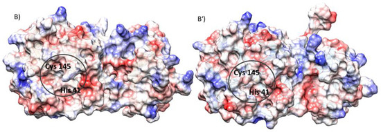Furthermore, the comparison of the electrostatic potential, shown in Figure 1B,B’, calculated for both protonation states of His41 by solving the Poisson–Boltzmann equation as implemented in the APBS code [59], reveals a more marked distribution of negative regions on the surface in proximity to the catalytic site of the SARS-CoV-2 Mpro HID. Moreover, the catalytic pocket volume changes dependently on Mpro-HID or Mpro-HIE (see Figure S5). Similar active site flexibility has been previously highlighted by Pavlova et al. [48].