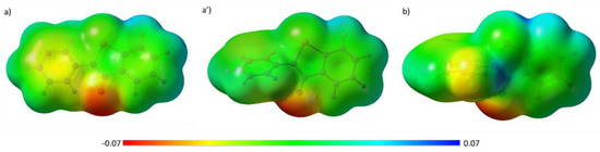 Molecular electrostatic potential (MEP) of: (a) planar EBS; (a’) nonplanar EBS and (b) EBS-OH geometries optimized at B3LYP/6-31+G level of theory.