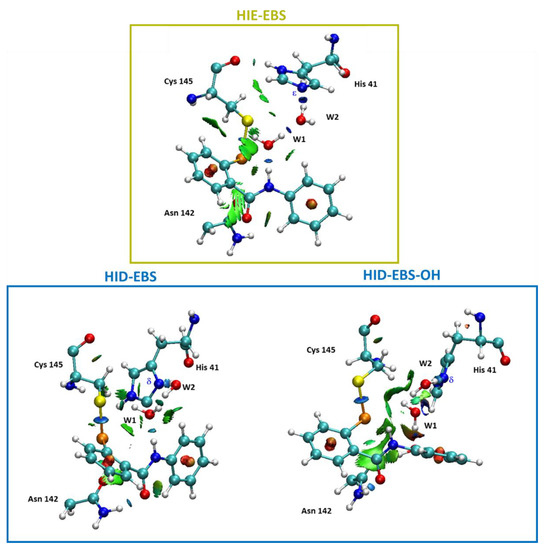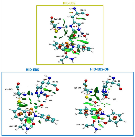 When EBS-OH is considered, the torsion angle Φ between two planes twists the biphenyl-like system to be perpendicular (Φ 84.5°), driven also by the formation of an H-bond between the OH substituent with the carbonyl side chain of the Asn142 present in the catalytic pocket (see Figure 5). NCI analysis clearly shows how the twisted conformation of the EBS-OH molecule results in a better fitting of the geometry of the active site. In the catalytic pocket of the Mpro-HID, the EBS assumes a less accentuated twisted conformation (Φ −42.7°) than that in EBS-OH, but more evident than that in EBS in Mpro-HIE (Φ −16.8°).