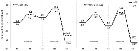 Since the reversibility of the reaction depends on the barrier of the reverse reaction, and with the inhibition process promoted by EBS and EBS-OH showing comparable activation barriers, the process with more exothermic results will also be more irreversible. On the basis of the described behavior of EBS and EBS-OH in Mpro-HID so far, our analysis leads us to propose [21] EBS-OH to be an irreversible inhibitor stronger than EBS. The assumption that the reactions of irreversible inhibitors are characterized by exothermicity higher than −22 kcal mol−1 [86] emphasizes our findings.