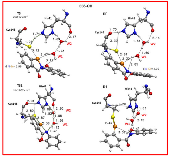 The knowledge of the inhibition mechanism at an atomistic level represents a crucial step in the pathway of drug design since it allows us to characterize the reaction path, including characterization of the transition state species which are undetectable at an experimental level. The investigation also extended to EBS-OH which may prove helpful to better understand if this kind of ebselen derivative can improve the selectivity action, a feature actually not present in ebselen [15,16,17,18,19,21]. As above mentioned, the additional hydroxyl group in the position ortho of the phenyl ring resulted in an increase of the inhibitory potency of ebselen by one order of magnitude [21].