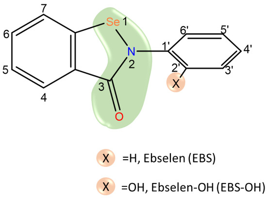 Sketch of ebselen, X group in position ortho of the phenyl ring can be H (EBS) or OH (EBS-OH). Ebselen warhead is evidenced in green.