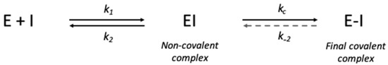 As reported in Scheme 2 the inhibition usually takes place in two steps. The compound must first bind noncovalently to the target protein, placing its moderately reactive electrophilic selenyl amide moiety, the warhead in ebselen (as circled in Scheme 1), close to the nucleophile (Cys145) of Mpro and giving rise to the enzyme−inhibitor complex (EI), in which the binding free energy (ΔGbind) depends only on noncovalent interactions and is related to the inhibition constant Ki. In the second stage a chemical reaction transforms the EI complex generating the final covalent complex (E-I). In the case of EBS this mechanism is proposed by MS/MS study [15]. Irrespective of the exothermicity, if high reverse reaction barriers are observed the bond formation is effectively irreversible, so k−2 will be zero (see Scheme 2).