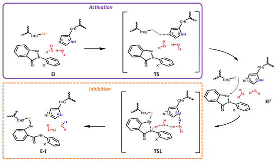In this way the highly nucleophilic thiolate anion is formed. This step is very crucial for catalysis performed by CPs [69]. The formed efficient nucleophile -CH2S(-) thiolate, is now able to perform the nucleophile attack on the selenium (TS1) with the formation of a new selenylsulfide bond and the concomitant ring opening, also as result of the water-mediated proton delivery on behalf of His41, finalizing the covalent inhibition (E-I).