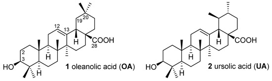 Plants have always played an important role in human health care [1]. The discovery of novel bioactive compounds from natural plants is one of the most effective trends in natural product research [2]. Among these, naturally occurring triterpenoids have found direct application as drug entities and play an important role as templates for the design, synthesis, and semi-synthesis of novel substances [3,4]. Pentacyclic triterpenoids, such as oleanolic (1) and ursolic (2) acids, contain a biologically active scaffold with a high safety profile in cancer therapy and are suitable to carry out different chemical transformations as several key positions (C2, C3, C12, C13, and C28, Figure 1). This inspires scientists to develop new methods for the chemical modification of the triterpene core, or to use well-known approaches to expand the effective pharmacological agents among the different types of triterpenoids.