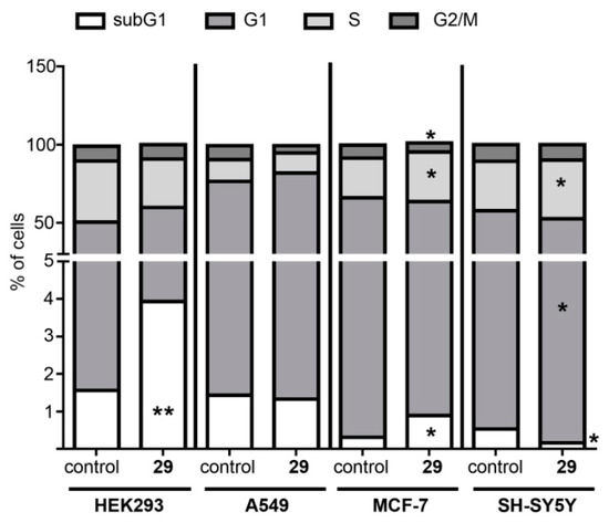 Cell cycle progression of HEK293, A549, MCF-7, and SHSY5Y cells upon compound 29 treatment. Data are expressed as mean ± S.E.M from three experiments, performed in triplicate. *—p < 0.05 vs. corresponding control (untreated) cells (Wilcoxon t-test); **—p < 0.01 vs. corresponding control (untreated) cells (Wilcoxon t-test).