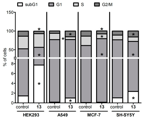 Cell cycle progression of HEK293, A549, MCF-7, and SHSY5Y cells upon compound 13 treatment. Data are expressed as mean ± S.E.M from three experiments, performed in triplicate. *—p < 0.05 vs. corresponding control (untreated) cells (Wilcoxon t-test).