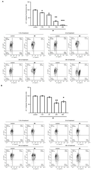 Mitochondrial membrane depolarization in HEK293 (A) and MCF-7 (B) cells upon compound 29 treatment. Cells were treated with compound 29 for 1.5, 3, 24 and 48 h. Data are expressed as mean ± S.E.M from two experiments, performed in triplicate (*—p < 0.05, **—p < 0.01, ***—p < 0.001 compared with control (untreated) cells; Wilcoxon t-test).