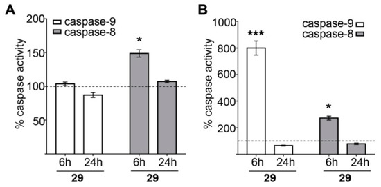 Caspases activity in HEK293 (A) and MCF-7 (B) cells upon compound 29 treatment. Cells were treated with 29 for 6 and 24 h. The activity is given as a percentage of the control group (untreated cells) considered 100%. Data are expressed as mean ± S.E.M from two experiments, performed in triplicate (*—p < 0.05, ***—p < 0.001 compared with corresponding control cells (shown as a dotted line); Wilcoxon t-test).