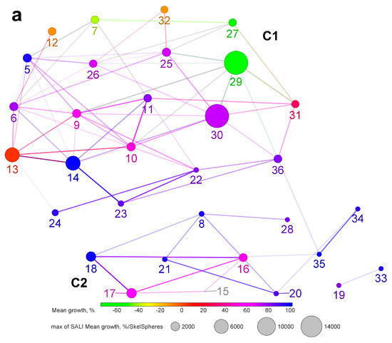The obtained network-like similarity graphs are shown in Figure 7. According to the SkelSpheres descriptor, which takes into account the mutual arrangement of the atoms and stereochemistry, the compounds were distributed rather uniformly. Two clusters can be recognized. C1 contains C3- benzylidene and indole-fused derivatives. C2 is comprised of C3-oxo and C3-nicotinoyloxy, lactame, and azepane derivatives, with all of them showing low cytotoxicity and flat SAR. The most active compounds belong to C1, but are separated with a large “chemical distance” and inactive analogs (except for 7 and 27, which differ only in C29 methyl position and have similar potency). Compound 13 demonstrates that the C28-morpholinyl fragment is clearly beneficial over piperazinyl and N-methylpiperazinyl (9, 10, 11) or free carboxyl (5, 6), and C2-4-nicotinoylidene is superior to 3-nicotinoylidene (5, 9), or furfurylidene (11). At the same time, compounds 7 and 27, comprising C2-furfurylidene and C28-carboxyl, are more active than 13, and the lead compound 29 features C2-3-nicotinoylidene and C28-N-methylpiperazinyl.