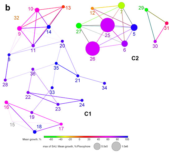 In order to systematically comprehend the biological data obtained and guide future drug design efforts, we performed a structure-activity relationship analysis with network-like similarity graphs [54] using the Rubberband Forcefield approach implemented in DataWarrior software [55]. In essence, it maps the studied molecules onto 2D-chemical space as graph nodes so that similar structures are located closely. Similarity relationships between them are shown as graph edges. In addition, the so-called Structure-Activity Landscape Index (SALI) is calculated for all pairs of similar molecules. The SALI value is proportional to activity change and inversely proportional to the dissimilarity between molecules. SALI defines the size of nodes and allows easy identification of activity cliffs when an abrupt change in activity is achieved with small structural modification. As an activity measure, mean growth percentages from NCI test panel cell lines were used. Chemical structures were represented with circular fingerprint SkelSpheres for fine-grained chemical similarity and with Flexophore to assess 3D-pharmacophore similarity.