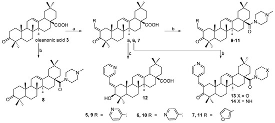 Synthesis of oleanolic acid derivatives 5–14: (a) 3- or 4-pyridinecarboxaldehyde or furfural, 40% KOH, EtOH, rt, 8 h; (b) i (COCl)2, CH2Cl2, rt, 3 h; ii N-methylpiperazine, piperazine or morpholine, CH2Cl2, Et3N, ∆, 5 h; (c) NaBH4, i-PrOH, rt, 3 h.